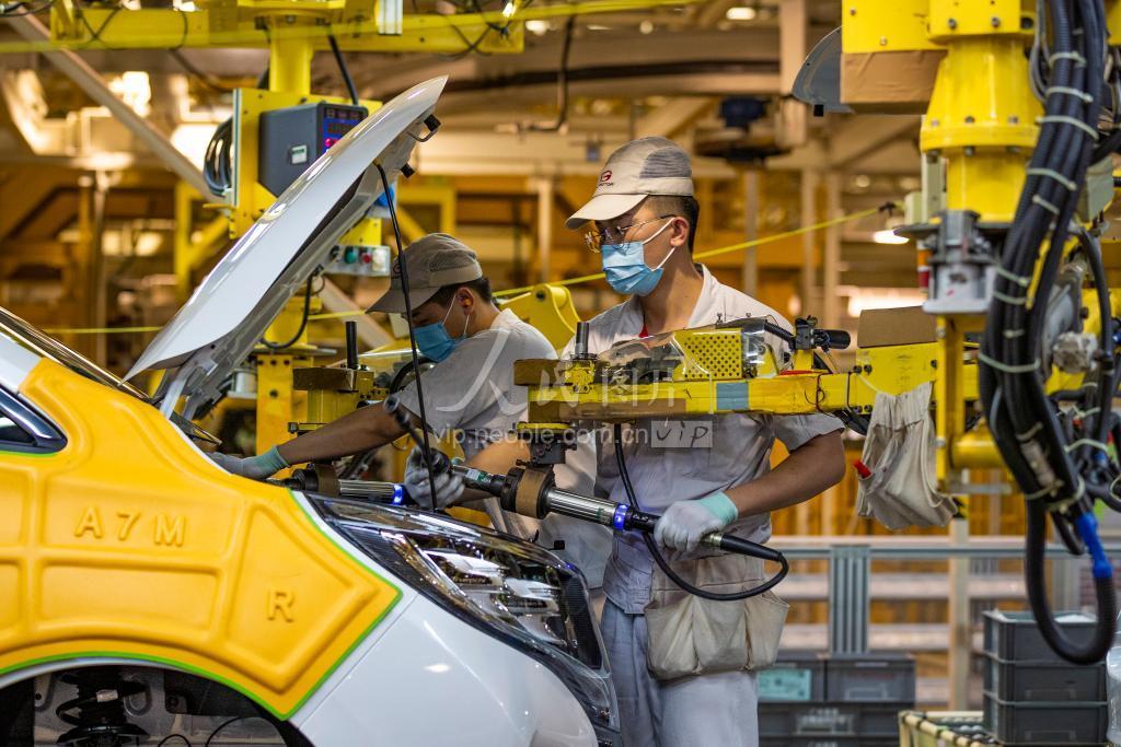 2020年5月23日,在位于广州市番禺区的广汽乘用车传祺汽车车间,工人们在周末加班加点生产,满足市场需求。广汽集团积极应对疫情影响,在3月份实现100%复工的基础上,一手抓生产,一手抓销售,携旗下各整车企业纷纷推出形式多样的销售措施。在各项政策措施的推动下,广汽集团已实现产销两旺,数据全面回暖,七大整车品牌仅4月单月产量就达到17.91万辆,同比增长7.11%,环比增长63.51%;销量16.63万辆,同比增长6.10%,环比增长50.50%。