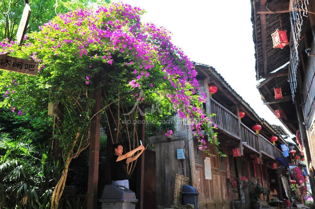 2020年5月23日,重庆市酉阳土家族苗族自治县龚滩古镇,游人徜徉在三角梅掩映的古镇石板街上。 连日来,重庆市酉阳土家族苗族自治县龚滩古镇栽植的十万株三角梅次第绽放,姹紫嫣红的三角梅花海与古镇的千年醇香交相辉映,引得游客纷至沓来。