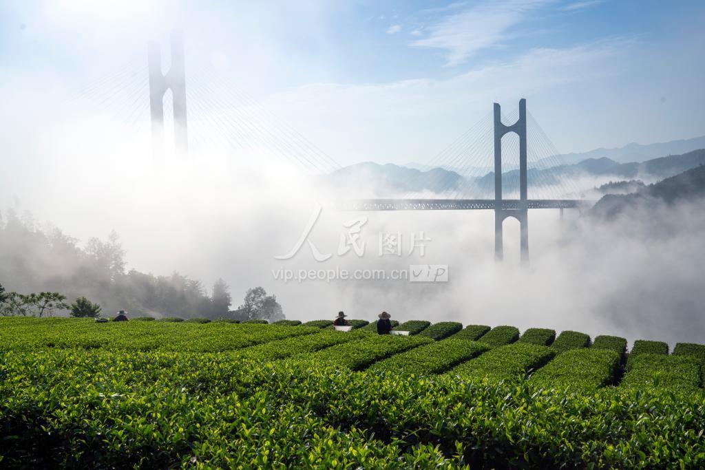 2020年5月23日,宣恩县晓关侗族乡倒洞塘村16组农民刘昌凤在自家茶园采茶,他前面的湖北恩来恩黔高速公路贡水河大桥云遮雾罩,宛若仙境。