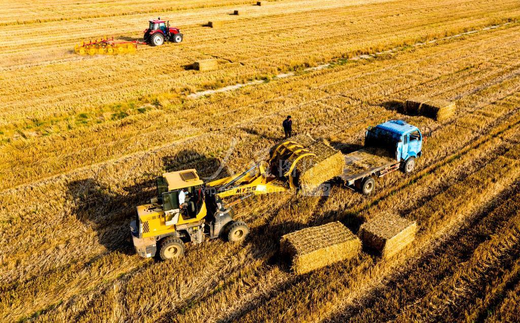2020年5月23日,安徽省合肥市庐江县白湖镇白湖社区的大田里,农业机械正在小麦收割后的稻田打捆麦秸,回收利用。 为解决秸秆焚烧这一环保难题,切实加强生态环境保护,促进秸秆资源综合利用,庐江县大力推广小麦、油菜等农作物收割打捆一体化作业。回收的秸秆用于养殖、生物质发电等领域,提高了秸秆综合利用率。目前,全县10多万亩的农作物秸秆实现打捆回收,有效促进了环境保护和农民增收。