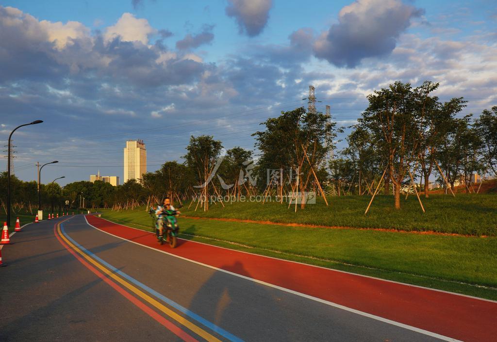 5月23日,居民在幸福湖湿地生态公园的环湖生态绿道上骑车。