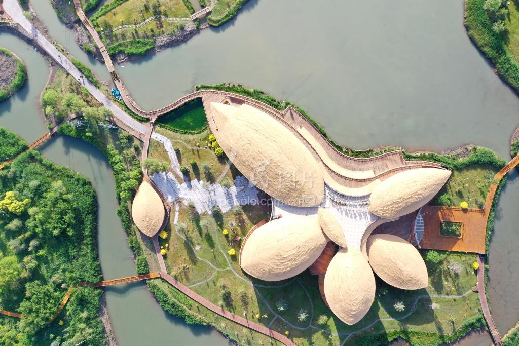 2020年5月24日,航拍甘肃省张掖国家湿地公园里的博物馆、廊亭、湖水和草木,景观独特,美如画卷。