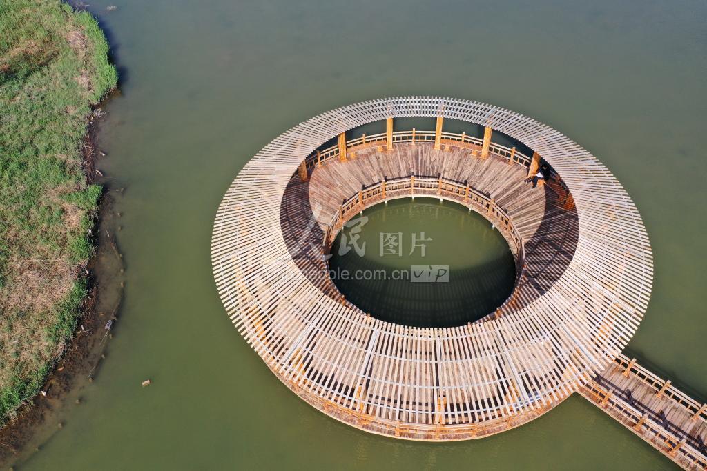 2020年5月24日,航拍甘肃省张掖国家湿地公园里的廊亭、湖水和草木,景观独特,美如画卷。