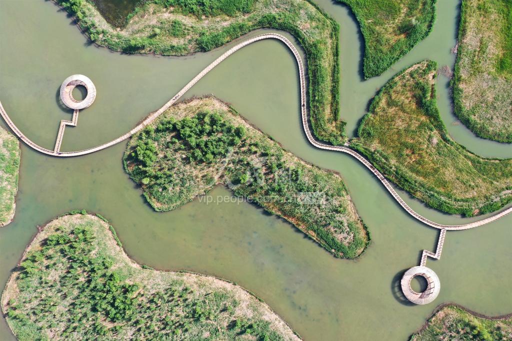 2020年5月24日,航拍甘肃省张掖国家湿地公园里的廊亭、湖水和草木,景观独特,美如画卷。