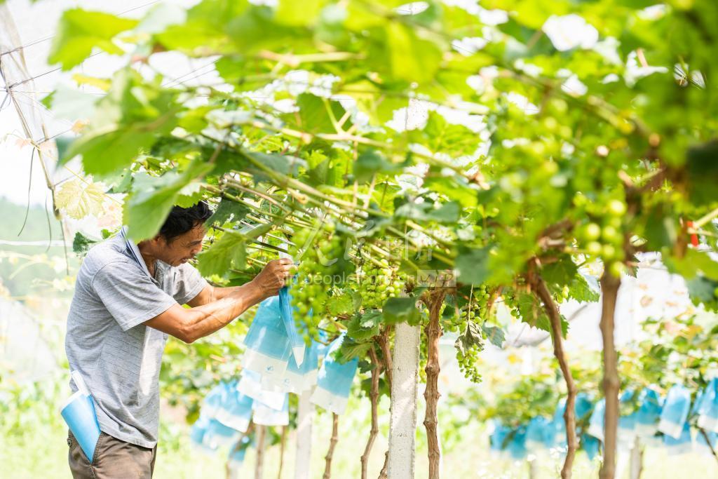 2020年5月30日,广西壮族自治区梧州市长洲区倒水镇富万村贫困户农民在扶贫产业项目葡萄种植基地护理即将成熟的葡萄。 梧州市注重组织贫困户发展特色产业,增加贫困群众收入,增强“造血”功能,实现可持续性脱贫。
