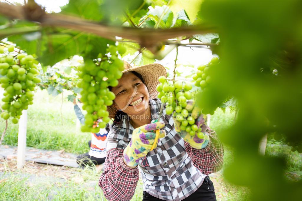 2020年5月30日广西壮族自治区梧州市长洲区倒水镇富万村贫困户农民在扶贫产业项目葡萄种植基地护理即将成熟的葡萄。