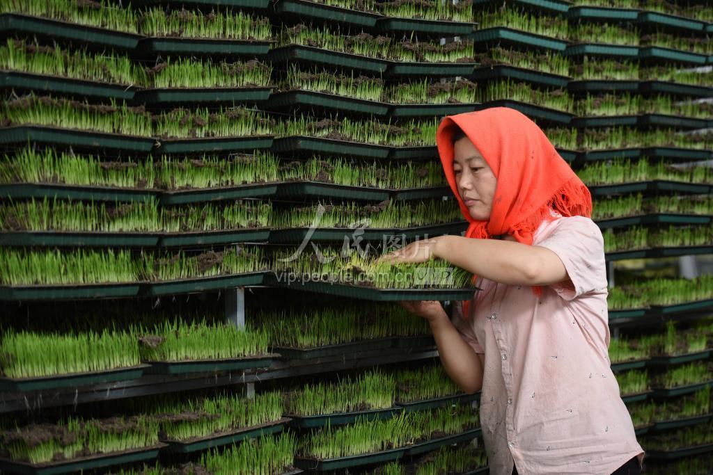 2020年6月5日,工人在育秧工厂中运送秧苗。江苏省淮安市金湖县金源农机合作社采取工厂化育秧模式,为农户提供种子、育秧和插秧的全流程服务。