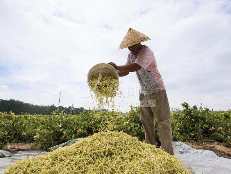 6月9日,在山东省胶州市洋河镇芍药洼村金银花种植基地,村民将采摘金银花倒在地头晾晒。