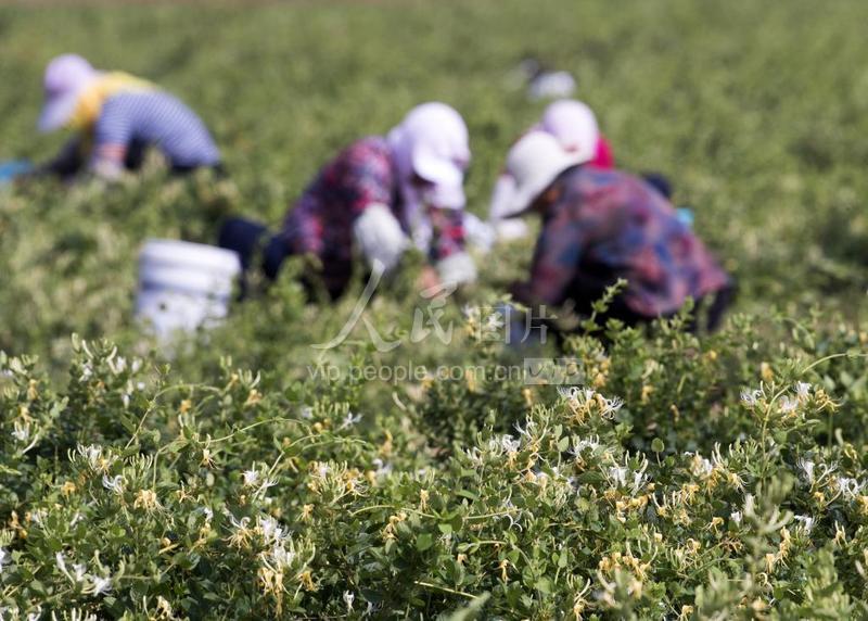 6月9日,村民在山东省胶州市洋河镇芍药洼村金银花种植基地采摘金银花。