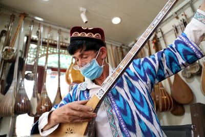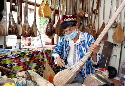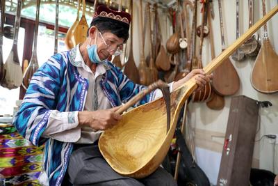 2020年6月13日,在新疆国际大巴扎景区一家“民族乐器行”,艾尔肯·吐么尔正在制作民族乐器。 新疆民族乐器制作技艺是国家级非物质文化遗产。今年60岁的艾尔肯·吐么尔是一位民乐器制作大师,是乌鲁木齐市级非物质文化遗产代表性传承人。他10岁开始随岳父学习民族乐器的制作技艺,他凭着对传统民族乐器制作技艺的热爱及近50年来不断钻研,熟练掌握了制作技巧。他制作的乐器不仅能演奏,还是十分漂亮的工艺品,深受国内外顾客的喜爱。