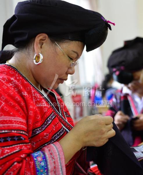 6月16日,在广西桂林市龙胜各族自治县瑶族服饰传承基地,学员在练习刺绣技艺。