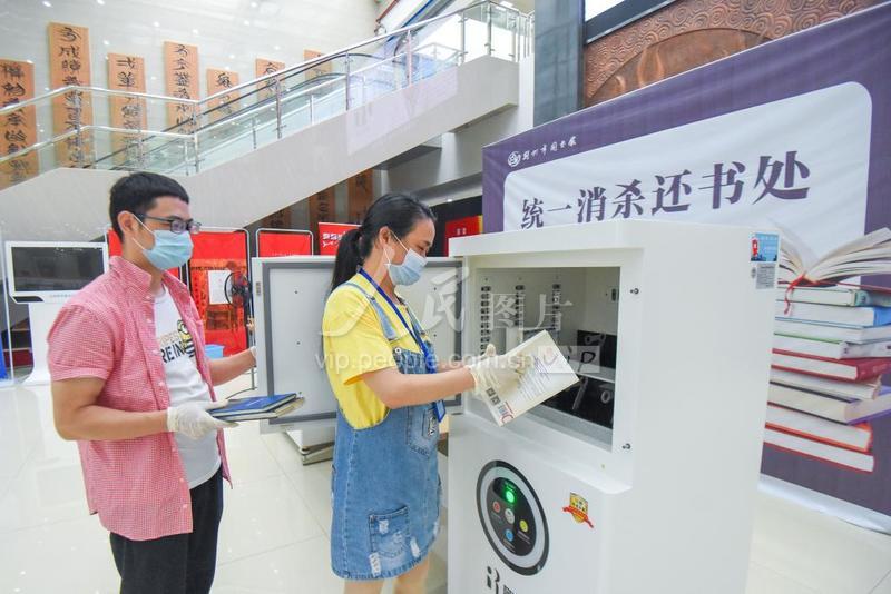 2020年6月23日,在湖北省荆州市图书馆,读者将归还的图书投放机器进行消杀。