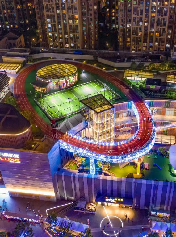 2020年6月29日,安徽省合肥市庐阳区海棠街道商业综合体万象汇的空中跑道,市民在散步健身,楼下广场的庐阳夜巷夜市人气正旺。