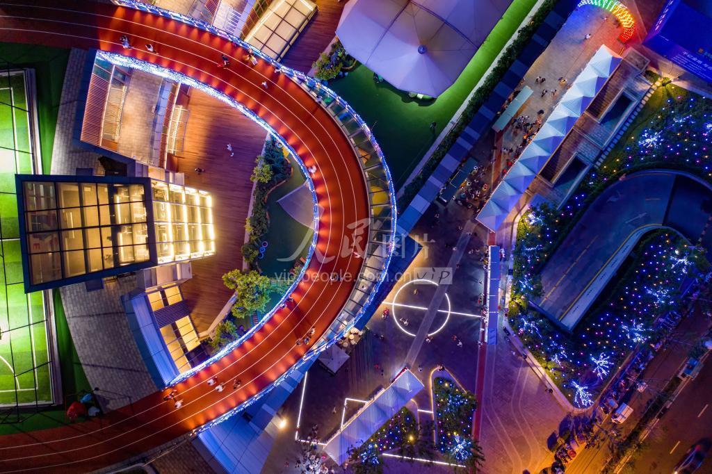 2020年6月29日,安徽省合肥市庐阳区海棠街道商业综合体万象汇的空中跑道,市民在散步健身,楼下广场的庐阳夜巷夜市人气正旺。