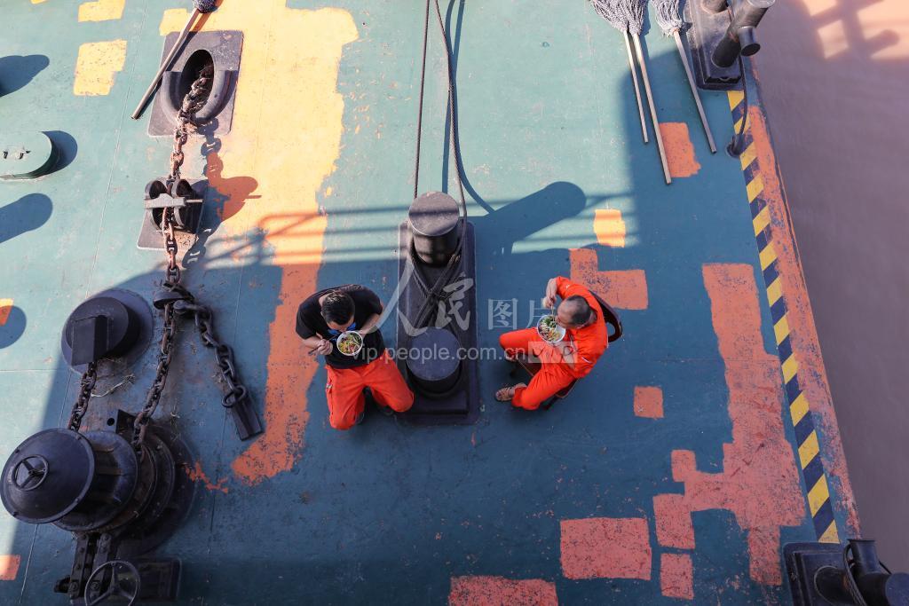 2020年7月2日,航标员正在用餐。受疫情影响,班组用餐从以往的圆桌式改变成为分餐制。