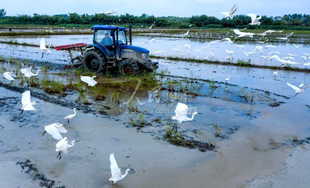 2020年7月3日,安徽省合肥市庐江县庐城镇棋盘村的大片藕田里,村民们正在运用大型机械翻耕藕田栽种水稻。 近年来,庐江县大力调整农业产业结构,推行藕稻轮作、藕虾共养等方式,实行“一田两用”来提高农民种植收入。全县种植稻田早熟花香藕达3万亩。花香藕在莲花开放时就能采挖上市,藕杆、藕叶翻耕过后变成有机绿肥,栽种的水稻绿色高产,“一田两用”成了当地农民增收致富的新途径。