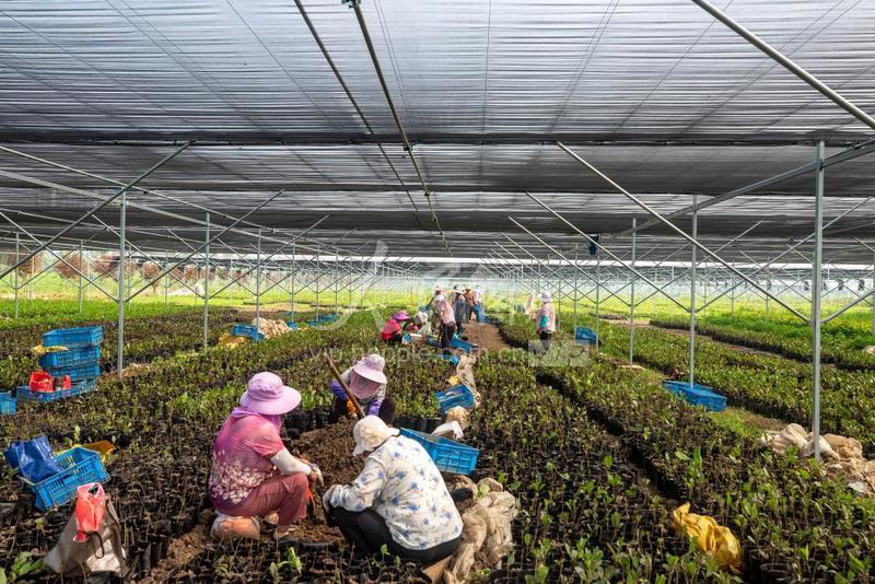 2020年7月5日,在江苏省宿迁市泗洪县城东碧根果生态示范园,几十名工人一边在遮阳棚下用营养钵罐装碧根果小苗。