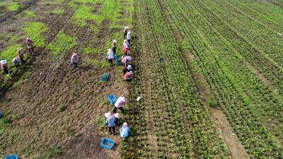 2020年7月5日,在江苏省宿迁市泗洪县城东碧根果生态示范园,几十名工人一边在遮阳棚下用营养钵罐装碧根果小苗,一边是大田移栽小苗。无人机从空中俯拍,近万亩示范园,沟渠路配套,大、中、小碧根果苗圃分布有序。 据了解,泗洪县作为全国首批“绿水青山就是金山银山”创新实践基地,近年来,积极做大碧根果产业,累计栽植碧根果近10万亩,培育碧根果苗木500万株,打造全国知名的“碧根果之乡”。碧根果促进了生态发展,推进了乡村振兴。
