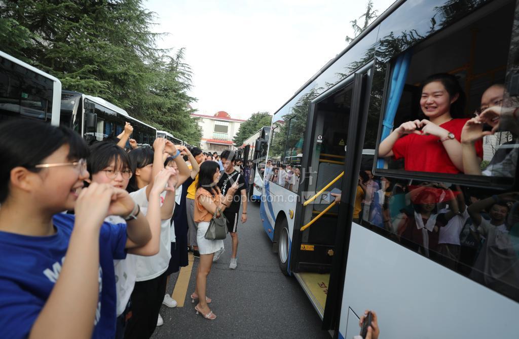 2020年7月6日,在湖南省衡阳市衡阳县第一中学,留在本校考点的同学送别同学奔赴其他定点考点时,彼此加油鼓劲。