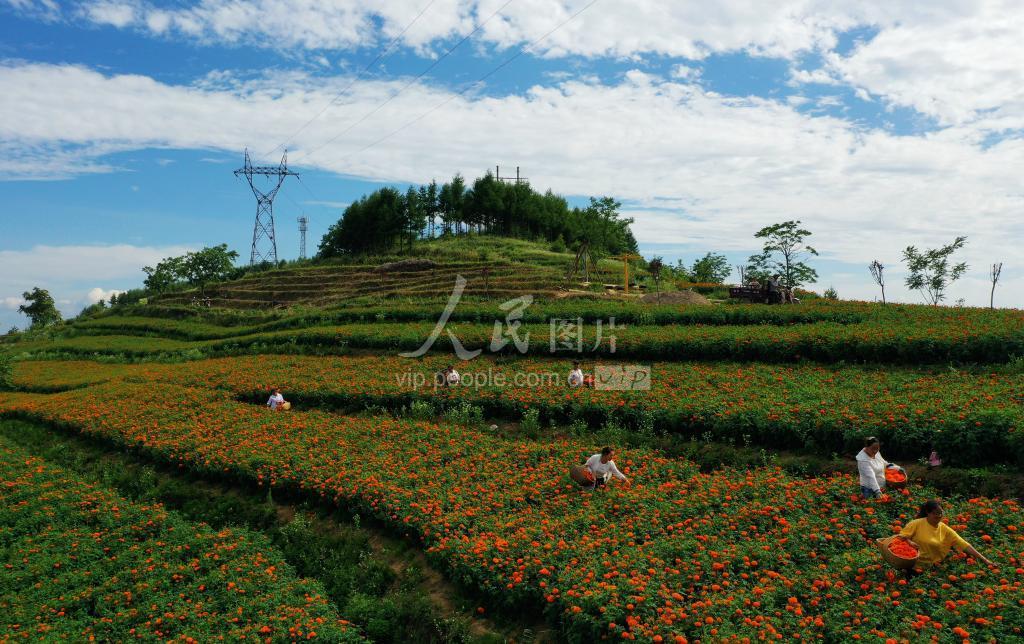 2020年7月8日,甘肃省陇南市成县2万亩订单万寿菊进入盛花期,当地种植户正在采摘。今年,在山东省青岛市城阳区东西协作扶贫帮扶下,该县带动当地7000多户群众采取“农户+合作社+企业”的种植模式,发展2万亩订单万寿菊产业。