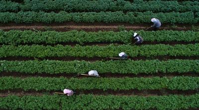2020年7月12日,甘肃省定西市安定区农民抢抓天气晴好有利时机,及时进行马铃薯中耕、锄草、深施肥等作业,田里一片忙碌的夏管景象。