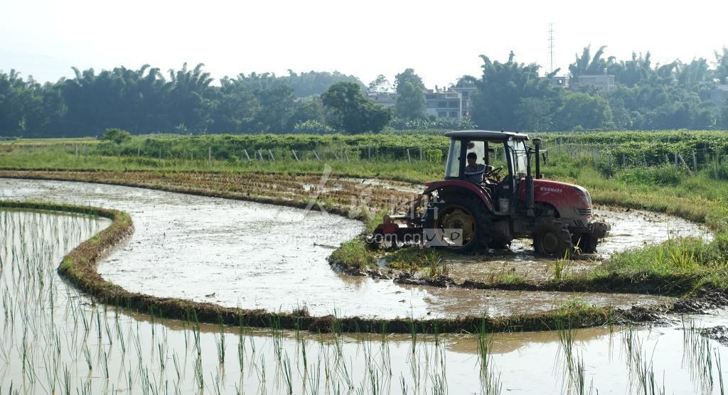 2020年7月14日,广西贺州市平桂区鹅塘镇农民在使用拖拉机耕田。