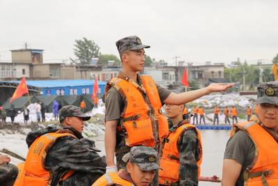 2020年7月16日,安徽省芜湖市鸠江区二坝镇长江无为大堤保安站在建工地,中国人民解放军73091部队数百名官兵正在搬运沙袋进行抢险。 7月13日,受长江上游来水和本地强降雨影响,芜湖市鸠江区二坝镇水楼村正在建设中的保安泵站基坑出现渗漏险情,极有可能影响无为大堤安全。险情发生后,700余名人民子弟兵和500多名地方防汛人员奋战保安站,力保大堤平安和人民群众生命财产安全。