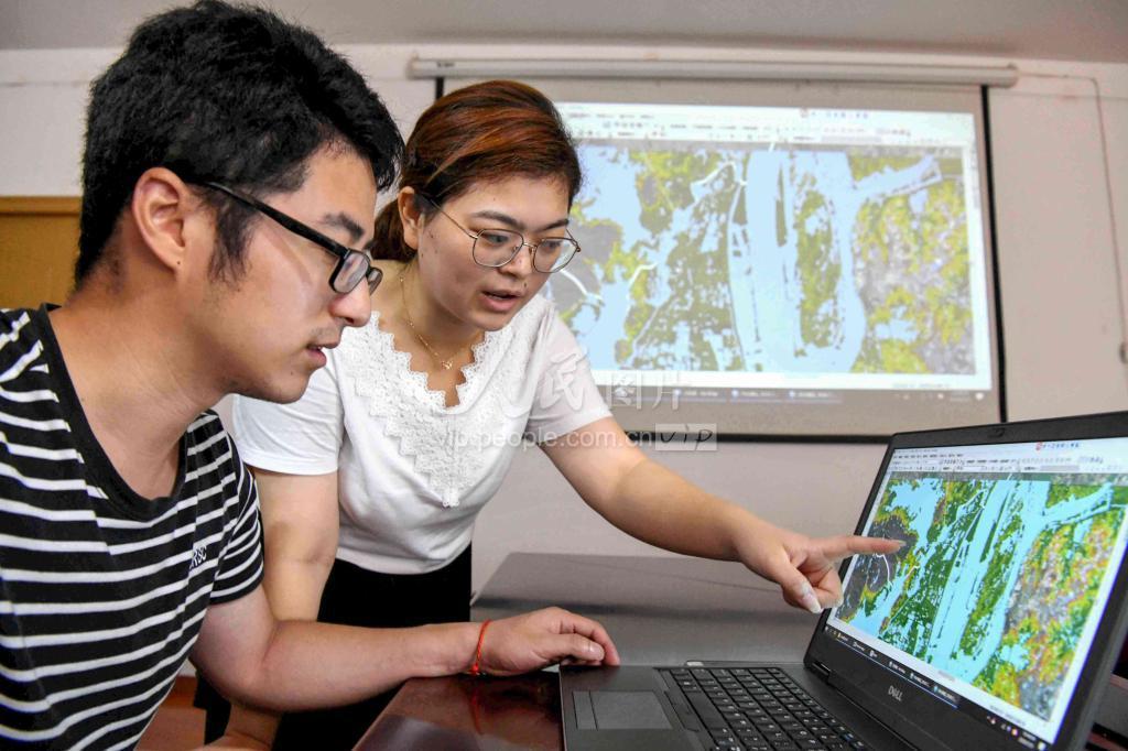 2020年7月21日,在安徽省地矿局321地质队高分卫星数据应用中心,技术人员在下载制作“高分三号”卫星安徽铜陵长江沿岸汛情遥感数据图像资料。