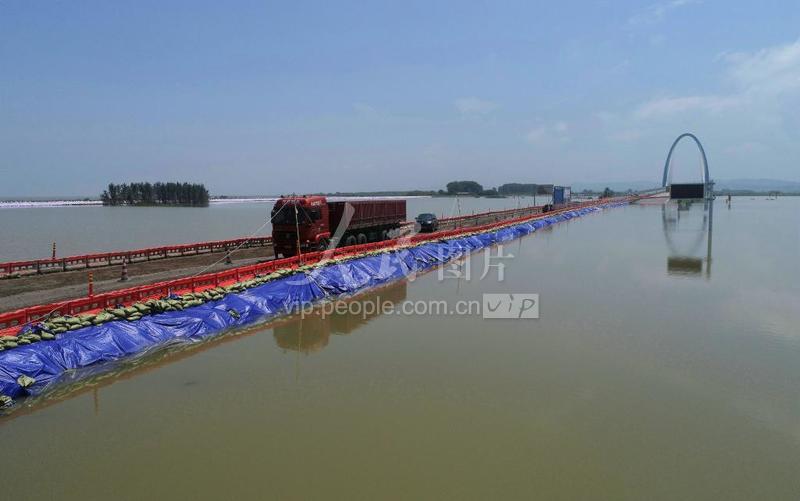 2020年7月25日,运输车辆在安徽省合肥市庐江县盛桥镇兆河大桥346国道与601省道共线段紧急抢通的半幅漫水公路上行驶。 7月20日,巢湖洪水漫过庐江县盛桥镇苍头圩堤坝,将346国道与601省道兆河大桥处420米共线段淹没,路面水深2至3米。当地市县交通运输部门迅速组织抢通队伍,昼夜奋战40余个小时,终于抢通该路段。