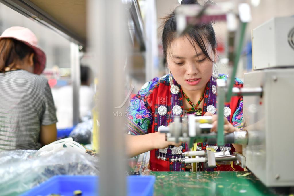 2020年7月29日,湖南省花垣县民乐镇易地扶贫安置区电子加工“扶贫车间”,苗家妇女在加工电子产品。
