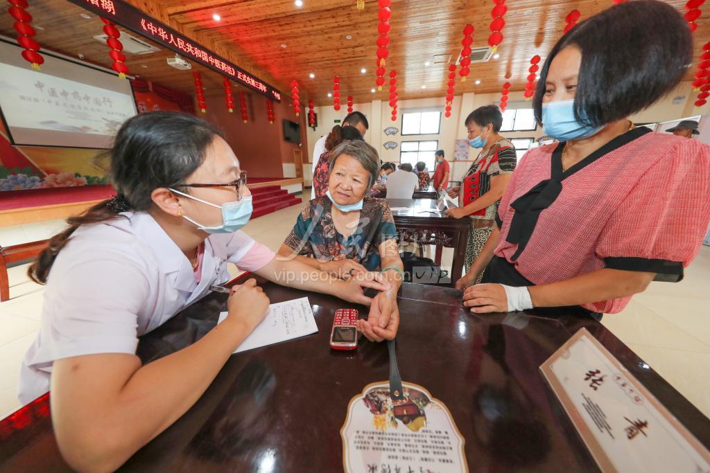 2020年7月30日,在浙江省湖州市德清县下渚湖街道朱家村文化礼堂,中医专家们为乡村群众义诊。