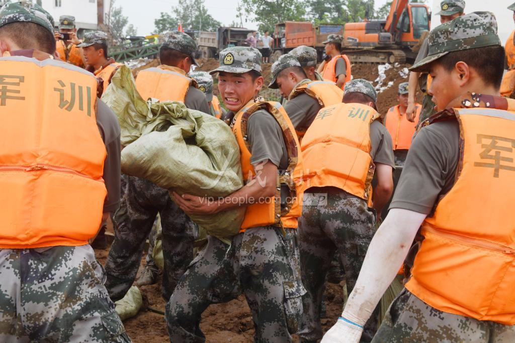 2020年7月29日,第71集团军“铁骨硬旅”的一名战士和战友们一起传送泥沙袋投掷封堵破损涵闸出水口。