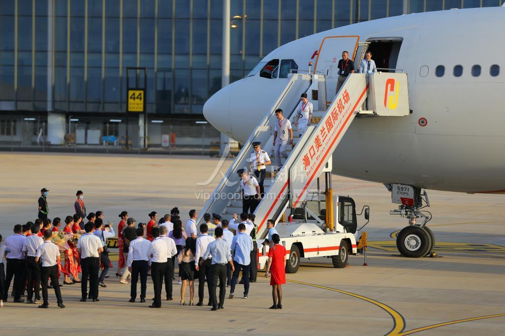 2020年7月30日,在海口美兰国际机场二期扩建项目的跑道上,A330宽体客机成功试飞,机组人员从飞机上走下。
