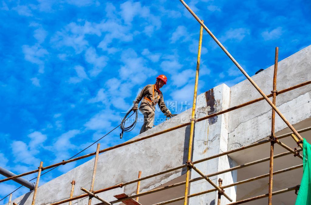 2020年7月31日,江西省九江市湖口县第五中学项目建设现场,工人正头顶烈日架设钢梁,有序推进项目建设进度。