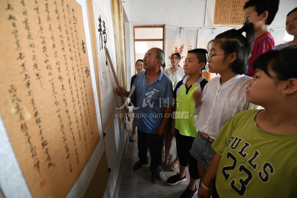 2020年8月1日,河北省邯郸市广平县十里铺镇南寺郎固村王魁士在公益书法课堂上给孩子们讲解书法字体的分类。