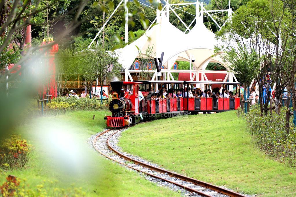 2020年8月1日,游客在江西省赣州市全南县江禾田园亲子乐园乘坐景区小火车游览。