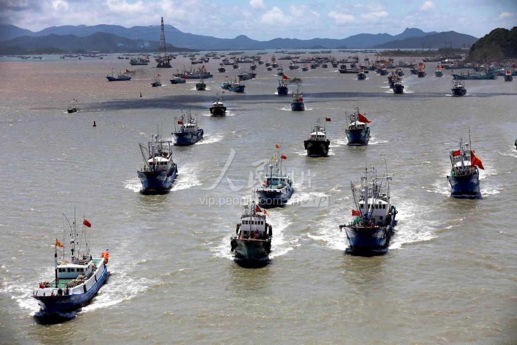 2020年8月1日下午,千艘渔船浩浩荡荡驶过浙江舟山朱家尖大桥,驶往东海渔场,开启新一轮捕捞作业。8月1日中午12点起,单船桁杆拖网(桁杆拖虾)、笼壶类、刺网类、围网类及船敷箕状敷网作业渔船结束了三个月的休渔期,舟山全市约有2200艘渔船解禁开捕,开赴禁渔线外的东海海域进行捕捞作业。