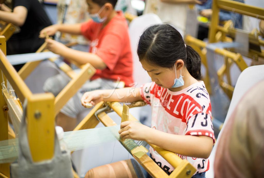 2020年8月1日,在“2020中国苏州文化创意设计产业交易博览会”现场,众多小学生踊跃体验缂丝工艺,感受中国非物质文化遗产的魅力,丰富假期生活。