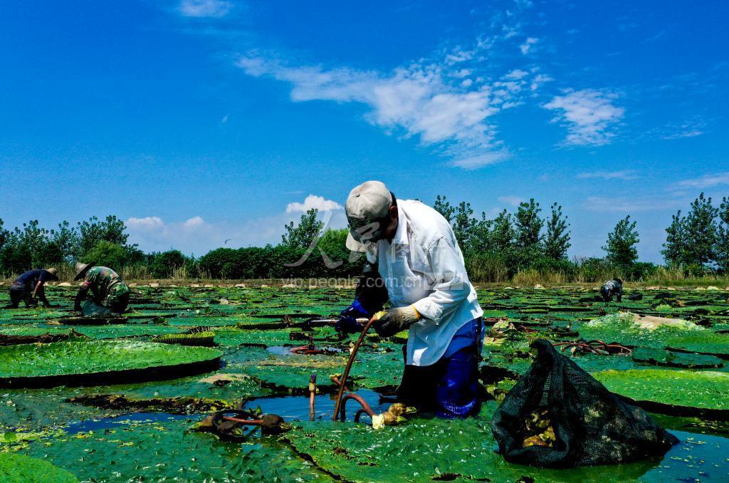 2020年8月1日,安徽省合肥市庐江县白湖镇杭头村的大圩里,农民们正在抢抓农时采收芡实。 芡实又名“鸡头米”,具有较高的营养及药用价值。近年来,庐江县充分发挥杨柳万亩水乡的水田资源优势,鼓励农民种植水生滋补植物芡实,水乡芡实种植面积达2万亩。仅此一项农民每年进账7000多万元,芡实种植带动一大批农民增收致富,小小芡实成了农民“致富果”。