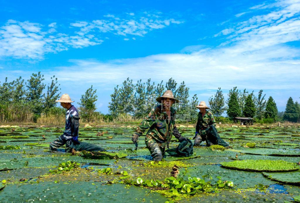 2020年8月1日,安徽省合肥市庐江县白湖镇杭头村的大圩里,农民们正在抢抓农时采收芡实。 芡实又名“鸡头米”,具有较高的营养及药用价值。近年来,庐江县充分发挥杨柳万亩水乡的水田资源优势,鼓励农民种植水生滋补植物芡实,水乡芡实种植面积达2万亩。仅此一项农民每年进账7000多万元,芡实种植带动一大批农民增收致富,小小芡实成了农民“致富果”。