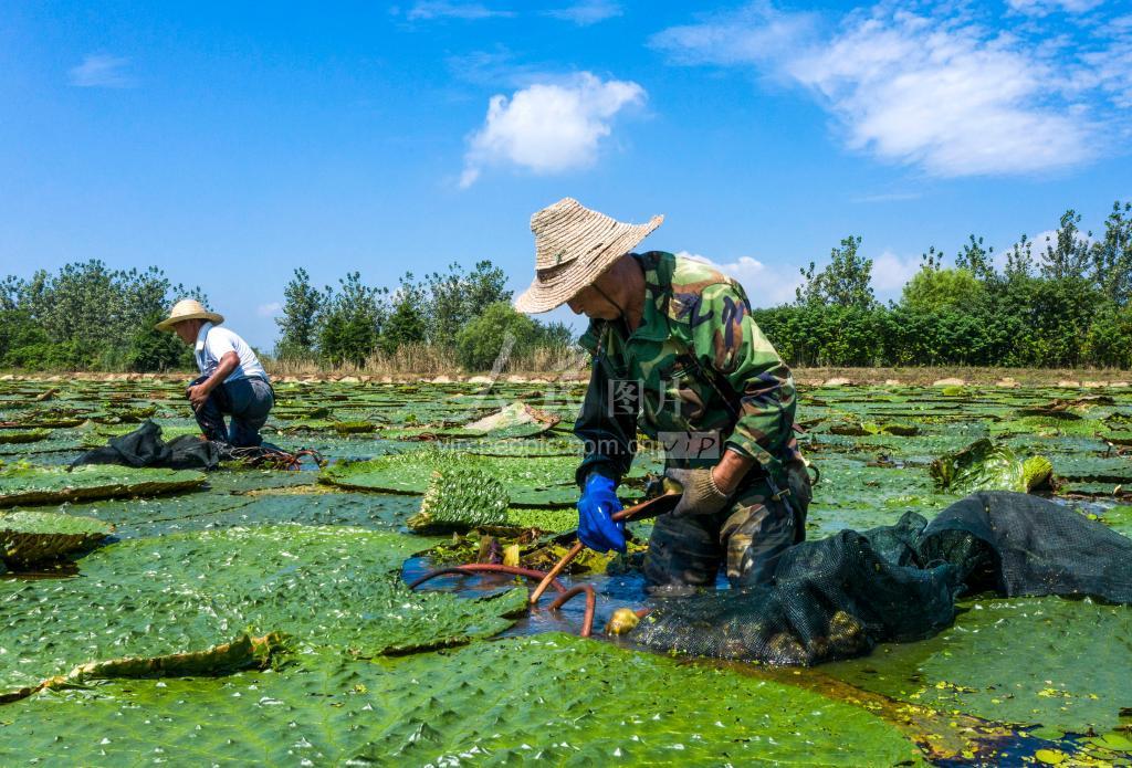 2020年8月1日,安徽省合肥市庐江县白湖镇杭头村的大圩里,农民们正在抢抓农时采收芡实。 芡实又名“鸡头米”,具有较高的营养及药用价值。近年来,庐江县充分发挥杨柳万亩水乡的水田资源优势,鼓励农民种植水生滋补植物芡实,水乡芡实种植面积达2万亩。仅此一项农民每年进账7000多万元,芡实种植带动一大批农民增收致富,小小芡实成了农民“致富果”。
