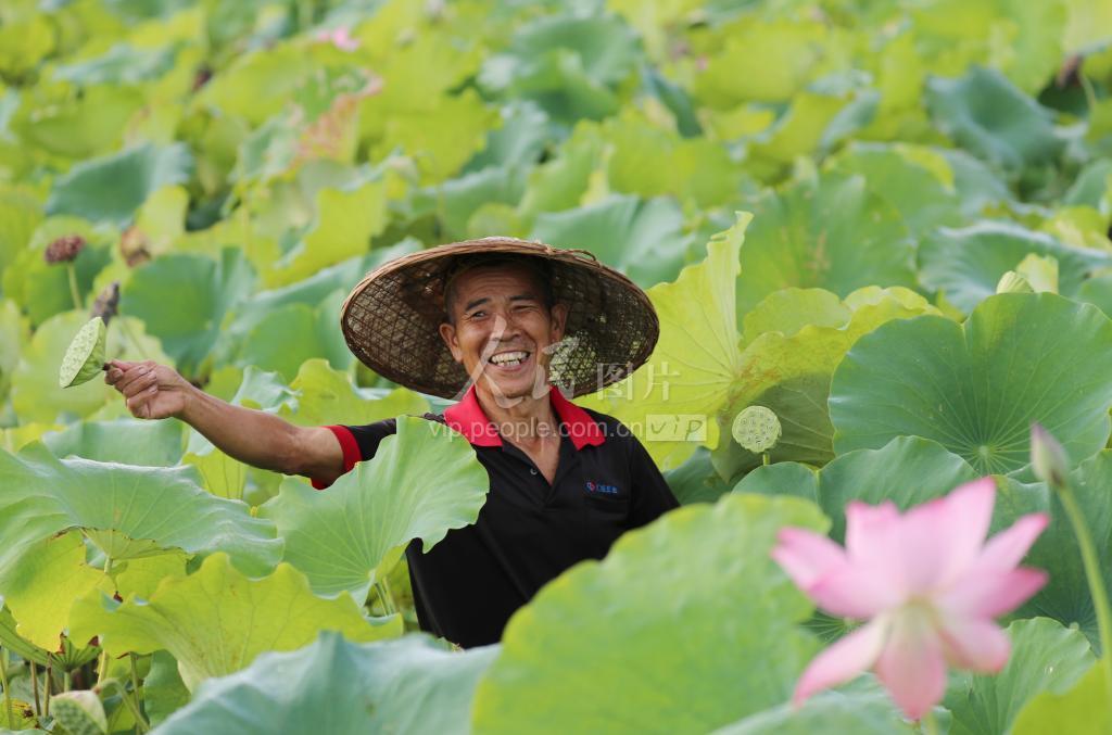 2020年8月1日,湖南省永州市新田县潭田村,村民正在荷花池中采收莲篷。近年来,该县潭田村抢抓脱贫攻坚和乡村振兴的发展机遇,种植荷花、向日葵等特色观赏经济农作物发展农业休闲旅游项目,吸引了众多游客前来观光,带动村民增收致富,助力乡村振兴。