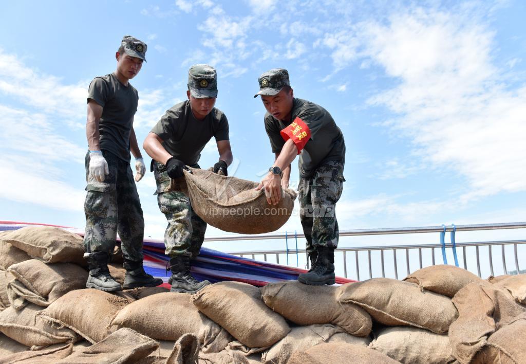 2020年8月1日,安徽省巢湖市,解放军某部官兵正在对巢湖大堤防浪墙进行降高处理。