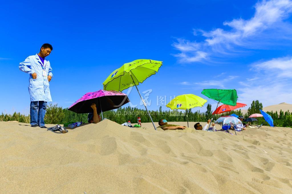 七月底八月初,正是暑期敦煌大漠天气最热的时段,甘肃敦煌鸣沙山下却出现一排排前来体验沙疗的人群,有远道而来的游客,也有当地的市民。原来,他们都是慕名来到敦煌市五色沙疗中心户外基地,体验沙疗、祛除病痛,达到强身健体的目的。 据悉,沙疗,又称埋沙疗法,诞生于13世纪初,因沙子中富含磁铁矿物质,在阳光的照射下,人埋其中可以治疗多种关节疾病,增加血液循环,因此广泛应用于具有沙漠地带的地区。据多年气象资料显示,每年7月至9月,敦煌鸣沙山系高温、干热,白天表层沙温高达65至75摄氏度,尤其适合沙疗。