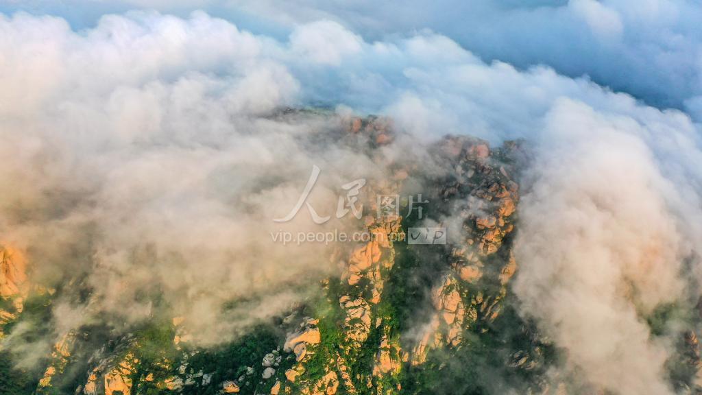 盛夏时节,雨后的山东荣成槎山国家级森林公园,山林间水汽蒸腾,形成壮美绝伦的云海奇观。山上云雾缭绕,村庄建筑虚无飘渺,远山近树隐约可见。从高空俯瞰,宛若“人间仙境”。