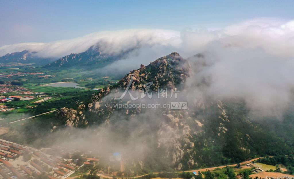 盛夏时节,雨后的山东荣成槎山国家级森林公园,山林间水汽蒸腾,形成壮美绝伦的云海奇观。山上云雾缭绕,村庄建筑虚无飘渺,远山近树隐约可见。从高空俯瞰,宛若“人间仙境”。