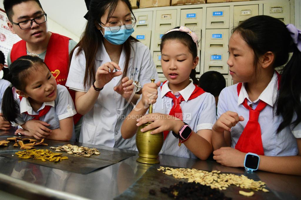 2020年8月2日,医务人员在指导小朋友和大学生志愿者体验中药材捣药技能。