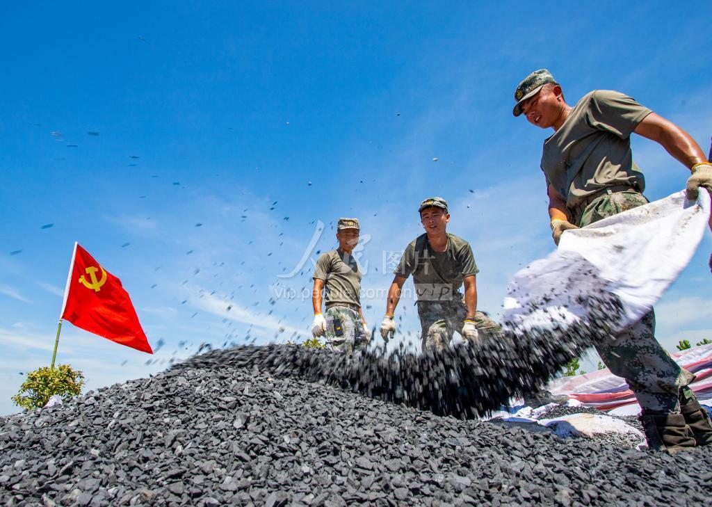 2020年8月2日,正值中伏天,驰援江西省九江市湖口县抗洪抢险的陆军第72集团军150余名官兵正在长江干堤,头顶烈日,挥汗如雨,清除加固干堤的临时子坝,确保交通平安畅通。