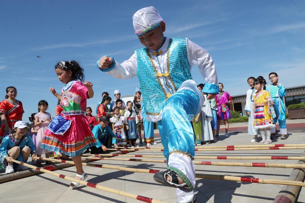 2020年8月2日,在浙江省湖州市德清县阜溪街道文化广场,孩子们正在跳竹竿舞,乐享暑期。