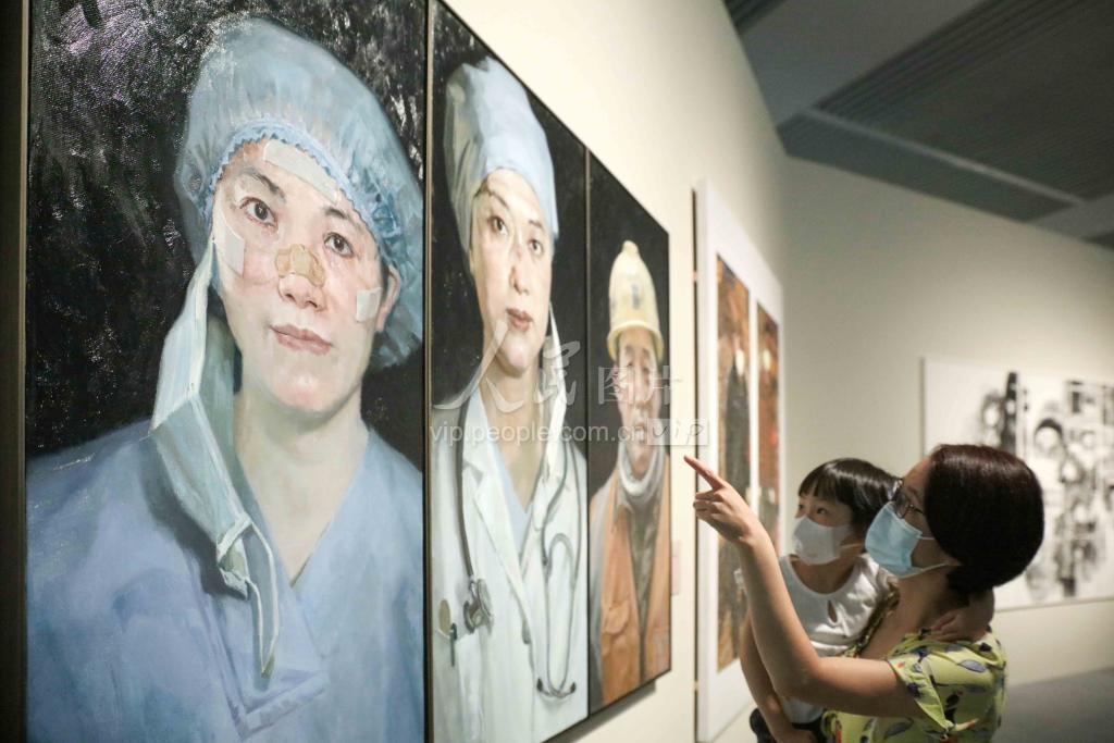 2020年8月2日,家长和孩子在参观抗疫主题美术作品展。